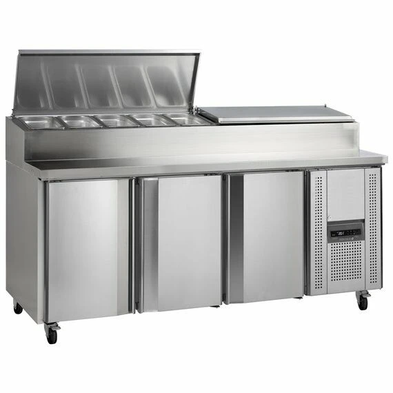 It has 3 solid hinged doors leading to the refrigerated section of the counter. Inside, the unit is able to provide an evenly distributed supply of cold air for the preservation of your merchandise. There is an off cycle defrost function to help prevent the accumulation of frosted ice within the chiller for enhanced efficiency. This unit is ideal for commercial kitchen equipment as it is durable and easy to clean.
